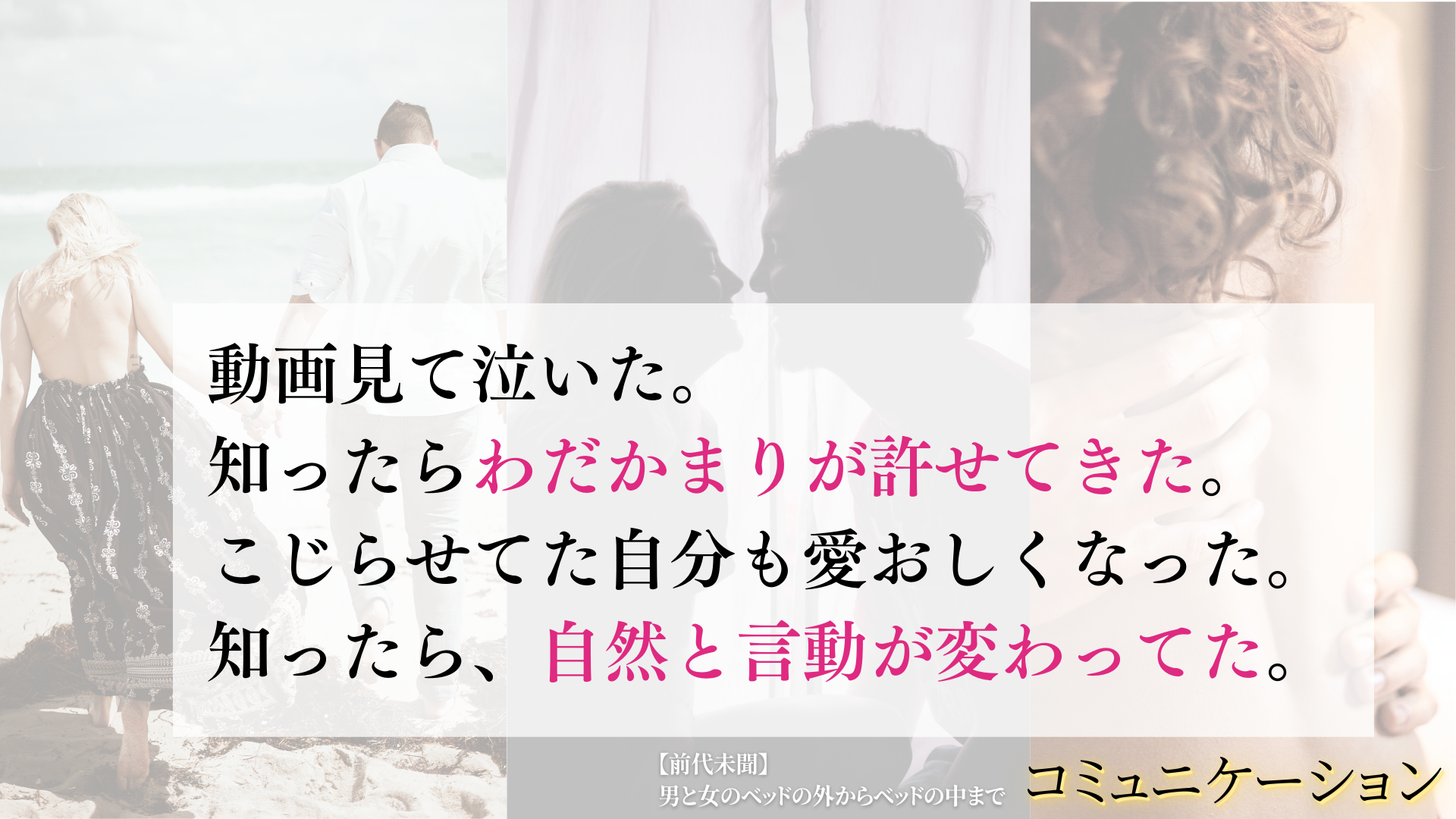 “自分自身が気づいていなかった過去の傷や、セックスに対する気持ちに気づく事ができました。自分では「これが原因かな〜」と思っていたことより、さらに深いところで傷ついたり、セックスに対する壁を作っていたんだなあと気がつき、驚きました。自分自身のセックスに対する気持ちが少しずつ変化してきているので、レス解消に取り組もうと前向きな気持ちになっています。(モニター60分間動画)”