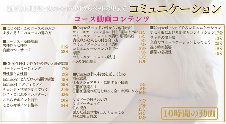 ベッドに入る前からの関係づくり、ライフスパンにおいてのホルモンや心理・性についても学べ、絆を深めることができる